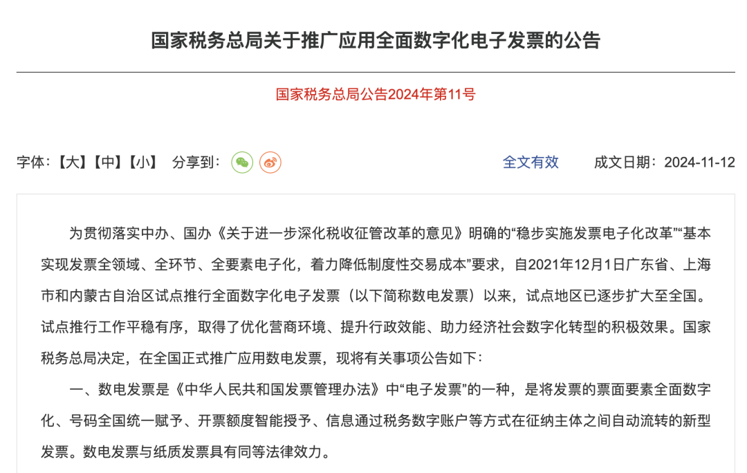 近日,国家税务总局发布《国家税务总局关于推广应用全面数字化电子发票的公告》,决定自2024年12月1日起,在全国正式推广应用数电发票!