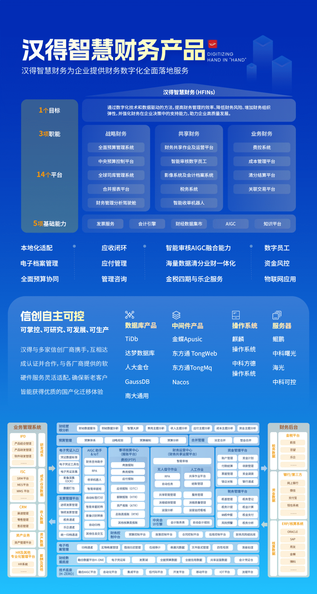 汉得智慧财务套件(HFINs)依托于先进技术和最新的管理理念,以开放式架构支持基于场景和业务需求的自由选装和场景化配置,帮助企业构建数字化时代的财务管理体系、财务组织架构和财务运营模式,在业务高速发展和信息技术快速变革的过程中,实现业、财、税的深度融合,实现5G时代的全财务域智能化管理。
