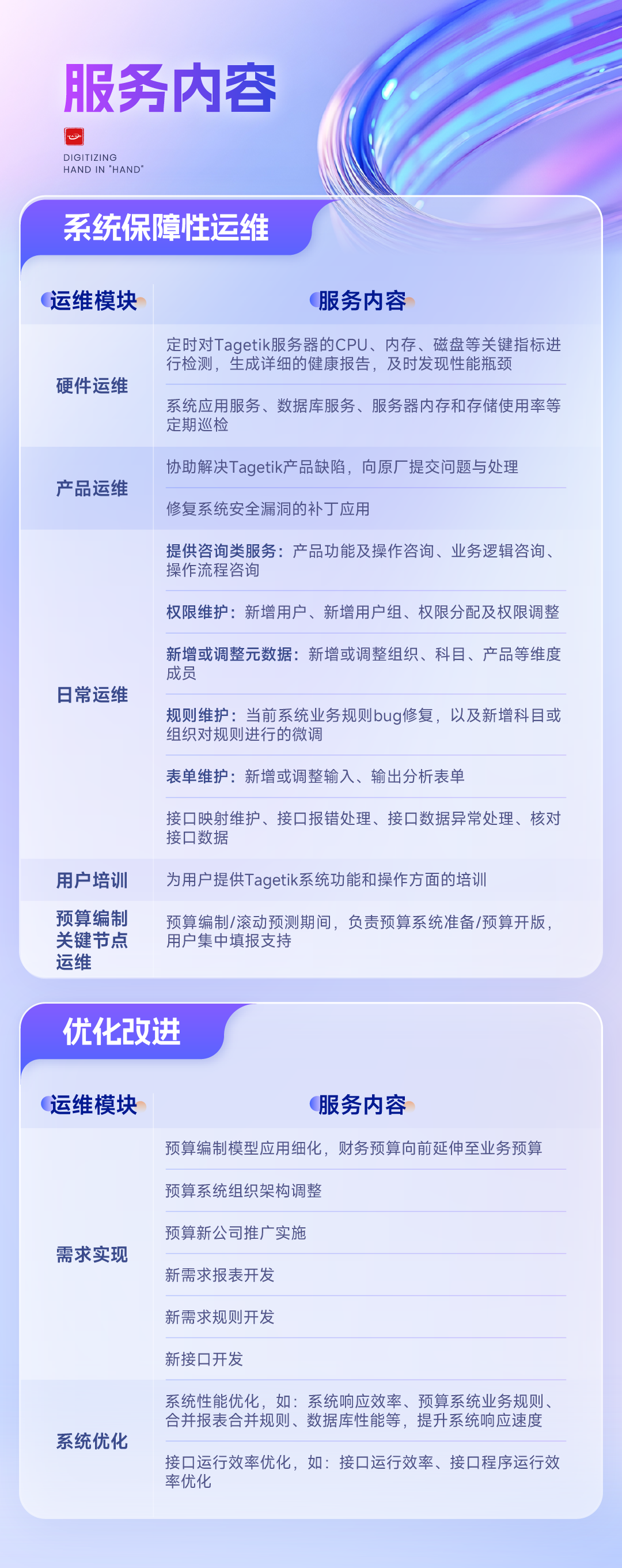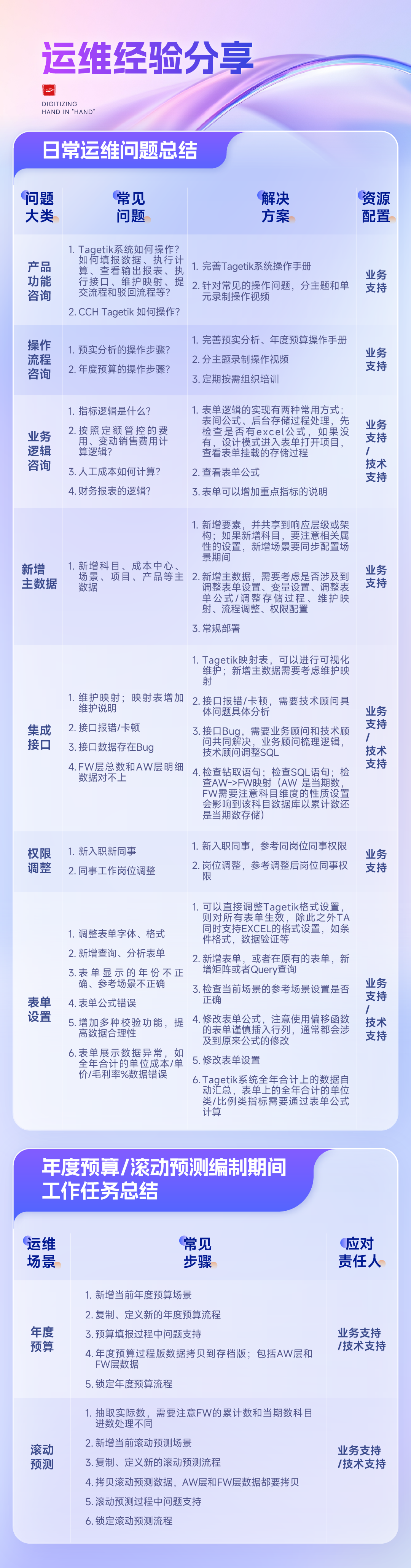 全面预算管理系统助力企业转型发展 全面预算管理是企业通过对战略目标的分解、资源的优化配置及运营过程的管控,实现企业精细化管理和战略落地的管理工具。 全面预算管理系统是一种通过数字化工具,能够实现企业预算编制、审批、执行、监控、分析及调整全流程自动化的管理平台。它将企业战略目标转化为可量化的预算指标,贯穿销售、生产、采购、财务等各个业务环节,解决传统手工预算效率低、协同难、数据滞后等问题,提升企业管理的精细化与智能化水平,更通过数据驱动帮助企业实现战略落地的全链条追踪与动态优化。 团队背景&业务聚焦 2021年1月,汉得管理会计与大数据事业部基于十年沉淀,抽调具备SAP BPC、Oracle Hyperion等系统落地经验的专家,在武汉组建远程运维中心,旨在构建专业化、标准化、规模化的企业绩效管理(EPM)系统运维服务体系。 团队专注为集团型企业在合并报表系统、全面预算、经营计划、管理报告等领域提供全生命周期服务,涵盖系统健康检查、日常运维、合并月结年结支持、预算编制专项支持、系统功能优化、产品版本升级、紧急求援等场景,通过远程+驻场的混合服务模式,实现客户IT成本的节约。 依托汉得管理会计与大数据事业部2000+项目经验库,团队已形成覆盖制造、零售、金融、地产、房地产经纪等多种行业的运维知识图谱。 打造企业高效运维体系 确保系统稳定运行 定期点检,及时掌握Tagetik系统运行状态,及时发现并解决潜在问题,保障系统全年稳定运行 建立完善的应急预案,针对服务异常、网络中断等突发情况,能在15分钟内启动应急响应,快速恢复系统服务 快速响应用户需求 项目指定经验丰富的业务专家、技术专家,在变更和新增业务需求时,能够快速响应和落地用户需求,保障业务工作的顺利开展 提升用户体验 定期对关键业务用户回访,收集用户反馈,及时识别提升Tagetik系统易用性和性能的优化点,提供优化解决方案。 从系统实际操作的角度出发,实现系统高效低成本运行 专业团队的三大核心优势 规模化的专业顾问 全方位保障能力 团队集结经验丰富的财务、管理会计与数据分析领域专业顾问,覆盖生产制造、医药零售、快消、互联网等20+行业。熟练掌握Oracle Hyperion、SAP BPC、Fone、丰贺、Tagetik等系统。成员不仅具备PMP认证及跨国项目经验,更配备持有CPA、ACCA、CMA证书的专业财务背景顾问,确保运维服务团队既懂业务痛点,也熟悉系统解决方案 高质量的服务能力 全生命周期服务 专业、扎实、负责任的服务态度与能力,在诸多行业沉淀有丰富的经验、知识库与案例库,为客户提供专业领域的咨询、推广、优化、运维等全面服务 系统搭建与升级 从环境配置、模板设计到版本迭代,让系统“随需而变” 监控与安全防护 监控系统运行状态,及时预警潜在风险,通过多重安全防护机制,保障数据安全与系统稳定 持续优化与创新 定期对系统进行性能评估与优化,结合新技术、新趋势,为系统注入新活力,提升业务竞争力 稳定可靠的运维能力 持续保障业务价值 灵活采用远程支持与现场服务,5×8小时日常运维,7×12小时关键节点运维,7×24小时紧急事件响应,帮助企业降低长期运维成本 协助企业提升竞争力 全面预算系统的价值并非来自工具本身,而是通过持续运维使其深度融入企业管理流程。未来,随着数字化转型的深入,预算系统将从“财务管控工具”升级为“企业级战略运营平台”,而高效的运维体系将成为企业在VUCA时代保持竞争力的核心壁垒。 汉得武汉运维中心始终以客户价值为核心,未来将持续投入EPM领域的产品应用,技术创新,探索AI驱动的智能运维、AI智能分析等前沿场景,助力企业提升竞争力。 如您想要了解详情或预约系统健康诊断,欢迎通过下方二维码与我们联系,我们将用心对待每一份回应。 携手汉得,共铸硬核竞争力!