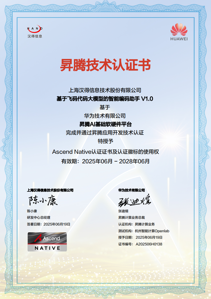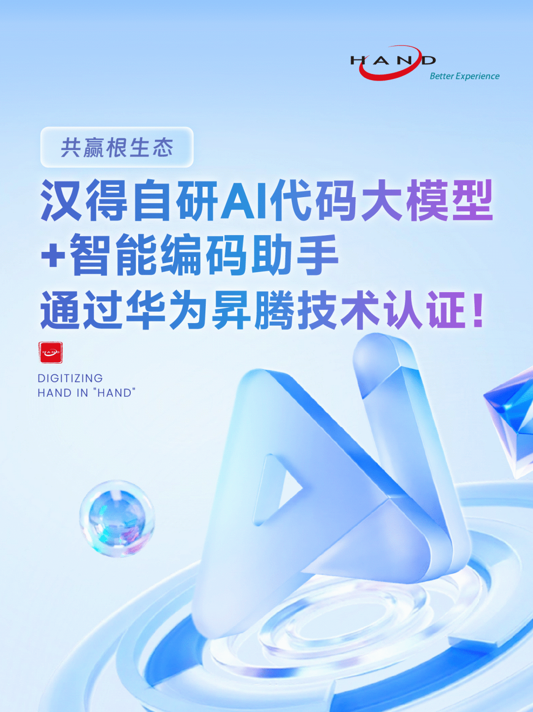 2025年6月20日,华为开发者大会2025(HDC 2025)在东莞隆重召开。汉得作为华为核心合作伙伴受邀出席本次盛会,与现场众多全球开发者、技术专家与行业领袖,共同探索科技前沿,聚力生态创新。 华为坚持以根技术不断创新突破为核心驱动力,同时全面构建多元协同的根技术生态体系,推动技术与产业深度融合。根技术是根生态的构建基石,根生态是根技术价值释放的肥沃土壤。 汉得作为华为云紧密合作的根生态核心伙伴,双方始终保持战略协同,致力于以“技术共融+场景共研”加速驱动AI技术在企业业务中的价值落地,共建AI全流程生态,覆盖企业从战略、场景、解决方案、平台架构、组织及治理等端到端全生命周期,并基于汉得AI中台构建联合解决方案,助力千行万业奔向智能化! 汉得代码大模型 + 智能编码助手 通过华为昇腾应用开发技术认证 会上,华为云新一代昇腾AI云服务全面发布,通过系统级的创新,打破传统AI服务器边界,致力于打造最适合大模型应用的算力服务。目前已为超过1300家客户提供澎湃AI算力,助力千行万业智能化升级。 汉得自主研发的“基于飞码代码大模型的智能编码助手V1.0”也已成功与华为技术有限公司“昇腾AI基础软硬件平台”完成兼容性测试,并通过华为昇腾应用开发技术认证,获得Ascend Native认证证书及认证徽标使用权。 汉得智能编码助手,基于H-AI飞码代码大模型,结合AI智能驱动与汉得H-ZERO专属规则驱动,支持AI代码对话问答、知识问答、智能代码诊断、智能代码补全、高质量汉得H-ZERO相关脚手架代码生成等场景,旨在提供更规范、高效的代码开发辅助,提升用户开发效率与代码质量。 汉得AI中台 x 华为云盘古大模型 加速AI应用场景化落地 本次大会,华为云重磅发布盘古大模型5.5,五大基础模型全面升级,致力于帮助企业构建属于自己的专业大模型。在过去的一年中,盘古大模型持续深耕行业,已在30多个行业、500多个场景中落地,发挥巨大价值。 目前,汉得AI中台全面对接华为云盘古大模型,能够帮助企业实现AI能力快速接入,结合业务快速编排AI助手应用。基于华为云盘古L0层基础大模型和L1层行业大模型,结合企业自有数据,能够在企业各个业务域实现L2层场景化落地,加速AI赋能企业业务。 华为云以昇腾AI云服务、鲲鹏云、鸿蒙应用上云、GaussDB数据库等根技术为基座,拥有全栈可控的产品和领先的技术能力,持续构建枝繁叶茂的根生态,携手伙伴们深入行业解难题,重塑千行万业。 汉得在营销、制造、财务、供应链等核心业务领域积累与沉淀了成百上千个场景解决方案,同时也不断投入与打磨出B端AI应用产品/服务「得·灵」等一系列企业级数字化产品,而且目前在制造域、营销域、财务域、供应链域及其他各个业务领域,已同步推出近百个成熟AI智能体,能够全面支撑企业构建AI能力体系及智能化升级。 未来,汉得与华为云将继续深化合作,协同创新,共同探索AI应用开发新范式,打造安全、可靠、稳定的企业级产品及专业服务,致力于帮助客户更好地拥抱AI,赋能企业AI应用在千行万业加速落地。 携手汉得,共铸硬核竞争力!