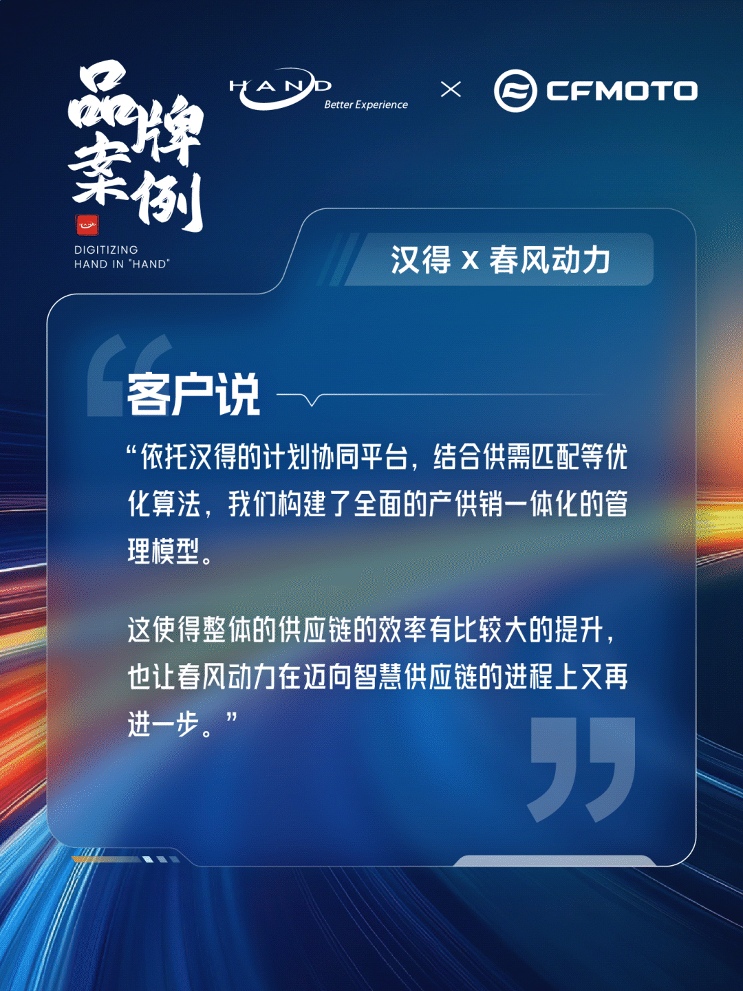 在30年的企业历程中,汉得始终在坚持做一件事:聆听客户的故事,了解他们真正需要什么。 90年代改革开放浪潮愈烈时,汉得通过IT实施服务帮助众多海内外企业重塑管理形态,迎接那个万物生长的激情年代。千禧年之际,汉得以定制化的IT解决方案为众多企业加速经营效率,紧跟油门到底的时代速度。2010年代,转型升级成为中国企业面临的最大课题,汉得数字化力量让众多海内外企业无惧风险,稳中递进。2020年代,新质生产力驱动变革,汉得以深厚的数字化行业积累助力客户重塑核心竞争力,加速突破未来。 时至今日,汉得依然在聆听企业客户的故事,并努力成为故事中帮助主角实现竞争力进化、打造新商业版图的最佳配角。在汉得的伙伴名录中,一段又一段传奇商业故事正不断展开。 品牌案例 汉得 x 春风动力 提到中国的机车产业,一定绕不开一个名字——春风动力。 三十多年间,春风动力始终坚守着中国创造之路,从1997年研发水冷发动机打破垄断,到2014年春风CF650成为我国国宾专用车,直至2016年在中国品牌从未涉足的曼岛TT赛场摘下名次,属于春风动力的创新征途从未止步。 目前,春风已在全球已设立多个研发中心及生产制造工厂,常年稳居中国品牌全地形车出口额第一、大排量跨骑式摩托车领域前茅。 伴随着春风动力在全球市场快速扩张,国内外工厂的逐步建设投产,集团总部对全球各基地的产能分配、销产供计划联动协同、订单交付进度统一管控亟需更有效的抓手。 多基地生产,多产品、多供应链模型,给春风动力集团计划一体化管控带来了前所未有的挑战。 在这样的背景下,春风动力与汉得正式达成了数字化转型战略合作,依靠汉得在摩托车生产和汽配加工行业的丰富能力,汉得HCMp计划协同平台在春风动力正式落地。 从需求到供应在线化管理,产能数据线上管理支撑辅助排程和模拟,销产供计划联动协同,春风动力真正实现了"一个计划"驱动供应链执行,帮助集团实现全球多基地的集团产能统一管控、基地生产计划、物料拉动计划的全面落地。 ▲ 杨国庆 春风动力生产制造部总监 随着数字化管理系统的焕新,春风动力对多基地产能分配完全线上化管控,基地订单排产效率大幅度提升,物料拉动周期显著缩短,助力春风动力实现极核、墨西哥、重庆工厂的快速建成投产。 “依托汉得的计划协同平台,结合供需匹配等优化算法,我们构建了全面的产供销一体化的管理模型,使得整体的供应链的效率有比较大的提升,也让春风动力在迈向智慧供应链的进程上又再进一步。” 每一次数字化的跃迁,都是汉得与客户并肩前行的故事。这些故事不断地发生、累加、递进,终成为汉得最珍视的财富。 未来,我们将继续倾听每一位客户的故事,用执着不息的专业和沉淀,为每一段核心竞争力的进化,全力以赴。 携手汉得,共铸硬核竞争力!