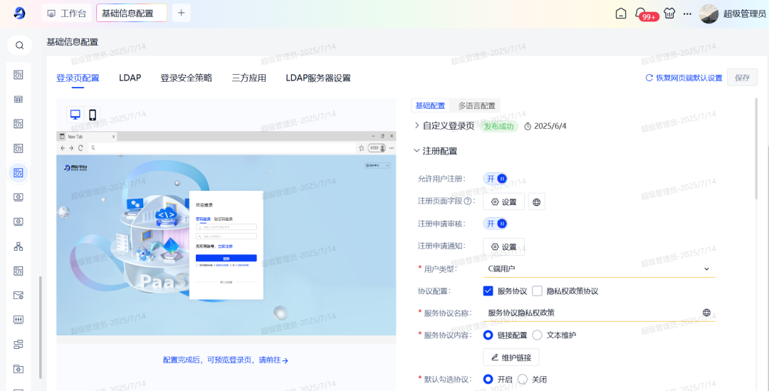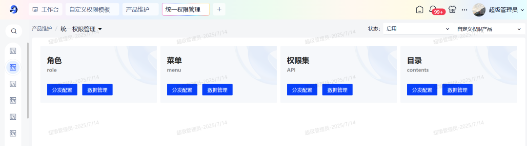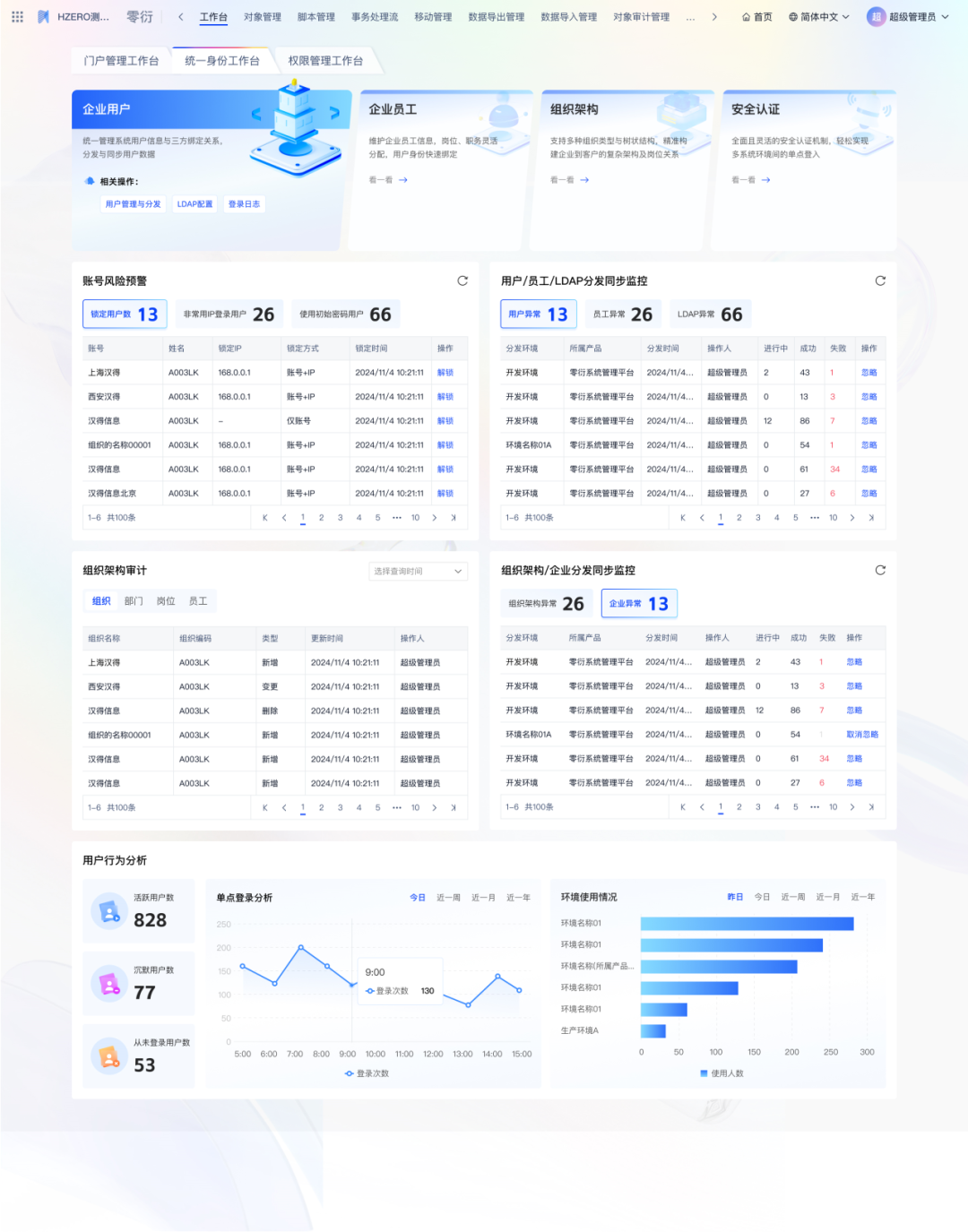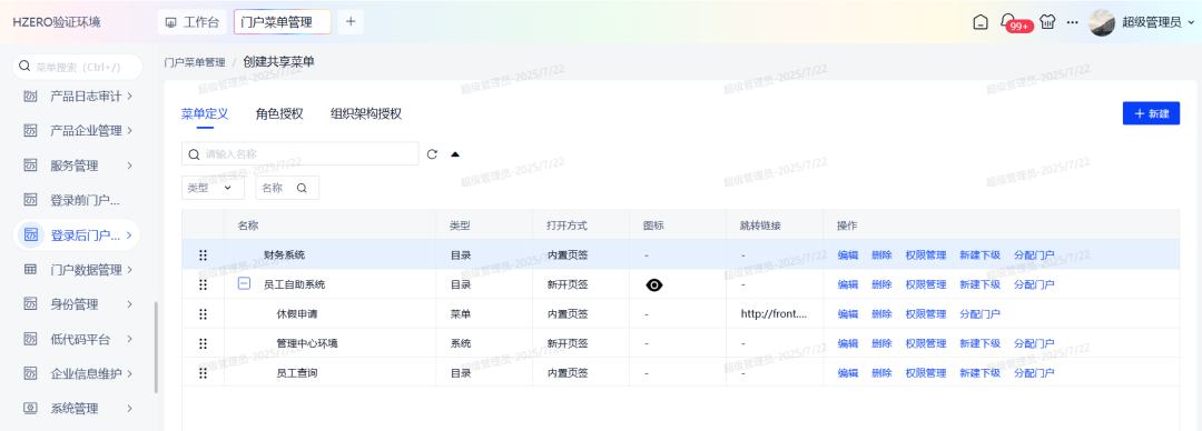 零衍系统管理平台(KINGPAAS,以下简称“零衍”)是一款以H-ZERO平台为底座,统一管理企业、用户、员工等身份信息管理、统一单点身份认证、统一平台主数据管理、统一域名管理、统一权限管理、支持登录页和门户自定义配置、支持多种单点协议的企业级应用产品。 本次发布主要从以下六个方面进行产品功能的升级和优化,新增自定义权限管理模块、提供用户注册准入功能、对门户细节进行优化提升、预置产品工作台等,旨在全方位增强产品核心竞争力,满足企业复杂的业务场景。 自定义权限管理:支持创建多套权限模版,配置资源类型以及之间的关联关系。提供多种方式维护资源数据,优化大数据量分发效率,轻松应对多权限模型的业务系统的管理要求 统一用户注册:提供统一的注册入口,支持管理员动态配置注册页面字段和功能,支持注册字段个性化拓展等,为用户带来全新的注册体验 产品工作台:预置三套工作台,提供门户、身份和权限模块的数据统计,满足客户对多维度数据统计分析的需求 统一门户管理:优化门户多语言配置、对多个组件进行属性调整和补充,进一步提升零衍门户组件库的丰富度。新增两套门户模版,风格多样供用户选择,同时优化门户加载性能、自定义组件渲染性能等,全面提升门户模块的基础能力 系统管理功能增强:细化产品维度和系统维度的管理模式,新增用户编辑权限控制,便于管理员精准管理和运维产品系统信息 身份管理功能增强:对身份模块的相关功能,如用户、组织架构增加个性化拓展字段,支持配置定时JOB分发数据,进一步强化用户身份管理 本次发版内容亮点功能 维护自定义权限模版 支持创建多套自定义权限模版,动态配置资源类型、资源字段以及资源之间的关联关系。 预置H-ZERO开发平台标准权限管理模型和通用RBAC权限管理模型,方便用户直接使用或者在此基础上拓展。 << 滑动查看下一张图片 >> 产品使用自定义权限模版 产品使用自定义权限模版后,可在配置好的资源类型下维护资源数据,资源数据间的关联关系,以及跟用户/组织架构的分配关系。 支持将资源数据和资源关联关系分发至第三方业务系统内。 << 滑动查看下一张图片 >> H-ZERO权限快速导出导入 针对H-ZERO体系的目标系统,支持快速导出相关的资源数据,再一键导入零衍平台,便于数据初始化。 注册功能支持可配置 提供管理员配置页面,对注册入口是否开启、注册页面字段显示、注册是否审批、注册结果是否通知等功能进行动态化配置。 注册页面字段可拓展 对接用户表个性化字段,允许将用户表添加的个性化字段配置在注册页面,让用户在注册页面填写相关信息。 统一登录页/登录前门户增加注册入口 支持用户填写注册信息并提交,注册成功后即可登录平台。同时增加移动端适配,支持移动端注册功能。 预置多套不同业务场景的工作台,动态进行数据的汇总与报表展示,方便管理员决策分析 门户管理工作台 提供门户功能快速入口,统计门户类型数量、发布记录及访问排名等数据。 统一身份工作台 提供组织架构和安全认证相关功能的快速入口,统计风险账号、用户行为分析、数据分发监控等报表,全面提高系统安全性。 权限管理工作台 提供产品系统管理入口,支持管理员快速进行权限定义、用户授权等操作,统计分析产品系统数量以及分发监控等数据。 新增两套门户模版 进一步丰富零衍门户模版库的风格,给用户带来更多的选择。 ◈ 简洁风登录前门户 ◈ 商务风登录后门户 门户多语言配置优化 提供全局多语言默认值配置,同时支持对单个门户和所有组件字段进行多语言维护。 门户支持自定义灰度配置 支持清明等重大事件灰色遮罩,配置门户灰度值以及生效时间等。 支持创建共享菜单并授权权限管理和分配门户 即多套登录后门户使用同一个目录菜单,同时共享收藏功能,避免了管理员重复维护数据。 门户tab组件增加左侧导航栏样式 除顶部切换样式外,本次新增左侧切换样式,丰富了此类组件的使用场景。 此外我们还对登录前门户/登录后门户增加背景图,支持图片自适应,提高门户配置的灵活度;对登录卡片、自定义快速链接、页眉菜单等组件进行属性优化,补充字体布局等元素、进行大小屏适配,增强组件可用性;优化登录后门户加载性能、自定义组件和自定义页眉渲染性能...... 更多门户新功能期待您的探索! 新增系统管理功能 以系统环境为维度进行管理,同时支持对产品和系统按照用户/角色/组织架构授权,用户仅可查看有权限的产品和系统,便于细化管理和运维。 产品和系统增加使用场景字段 新建/编辑产品和系统时,支持勾选使用场景,根据使用场景显隐部分功能和字段,使页面更加简洁,方便用户操作,提升用户体验。 身份模块增加个性化字段拓展支持 用户表、组织/部门/岗位表、职务表均增加个性化可拓展字段。用户可根据实际需求添加字段,同时支持个性化字段的分发和导入导出。 支持配置定时JOB分发数据 组织架构和员工相关的数据支持配置定时JOB进行分发,减少了运维工作量,同时提升数据分发效率,最大程度保证数据一致性。 以上主要从六个方面介绍了零衍V1.4.0版本的产品新特性,更多功能细节可参阅开放平台文档或联系研发团队。未来我们将持续迭代新版本功能,期待与您的交流~ 1. 如果您想了解零衍更详细的功能